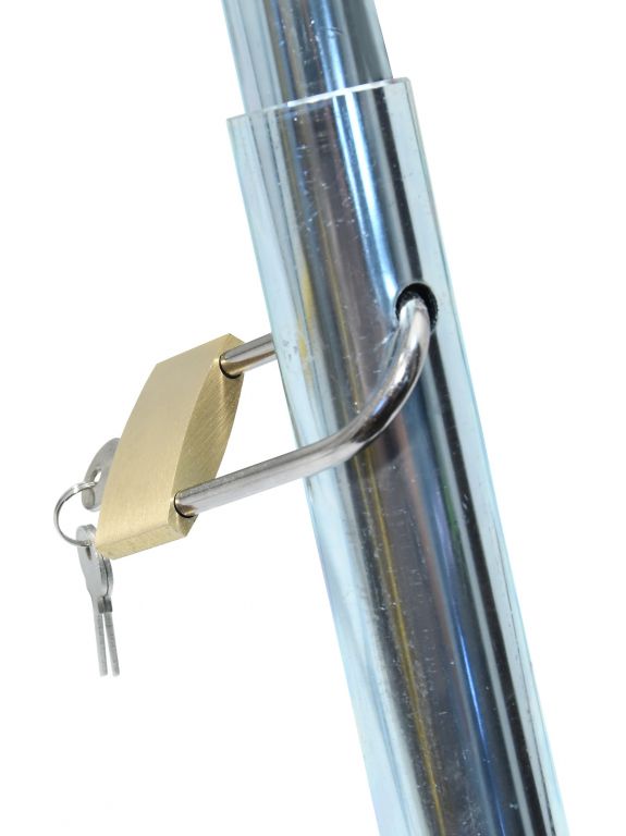 Zábrana je tvořena robustní konstrukcí s povrchovou úpravou vhodnou do venkovních prostor. Zamykání je řešeno visacím zámkem umístěným na šikmé, teleskopické části konstrukce, tak aby po odemčení bylo možné zábranu jednoduše a rychle složit.