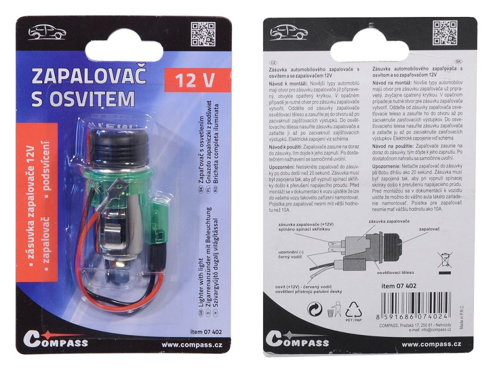 Zapalovač s osvitem pro montáž do automobilů s napětím 12 V.