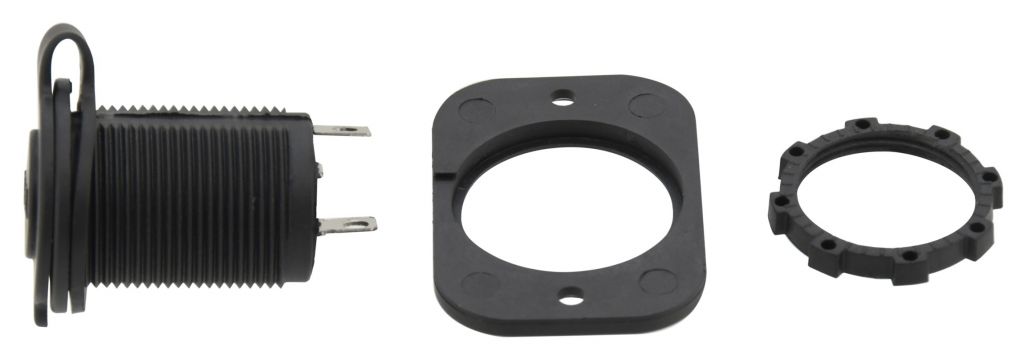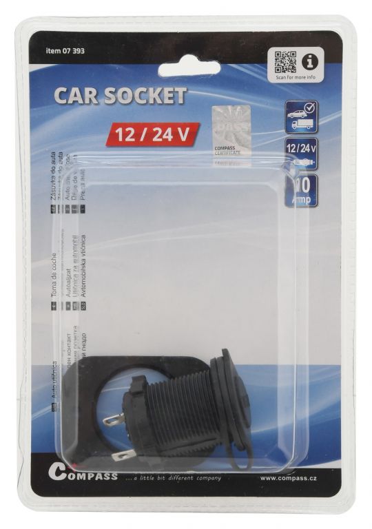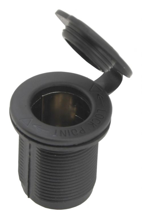 Zásuvka určená pro montáž do vozidel s napětím 12V / 24V. Slouží jako dodatečný slot napájení uvnitř vozidla, v zavazadlovém prostoru, například pro autoledničku, osvětlení atp. Za zmínku stojí gumová krytka, která slouží jako ochrana při nepoužívání zásuvky. Montáž je jednoduchá a rychlá, zásuvka se umístí do předvrtaného otvoru na určeném místě a dotáhne se pomocí matice ze zadní strany, pro ještě jistější uchycení se může z přední strany přišroubovat pomocí dvou šroubů. Díky krytu se do zásuvky nedostane prach.