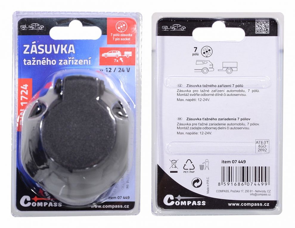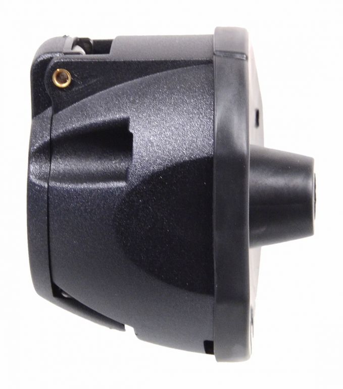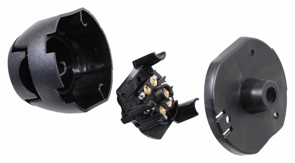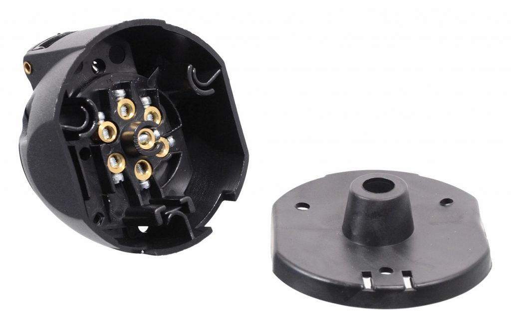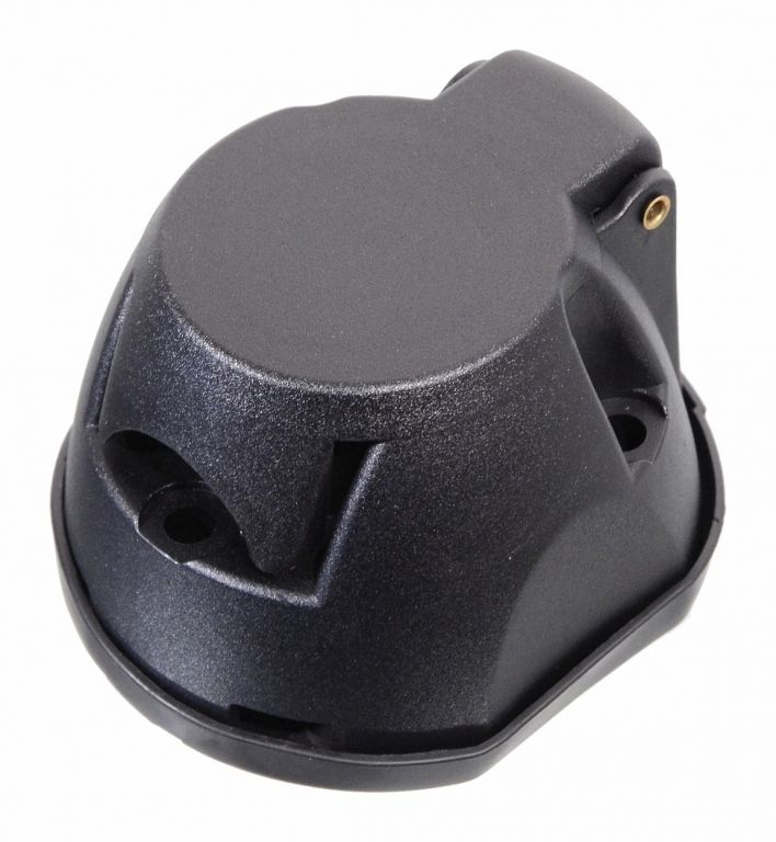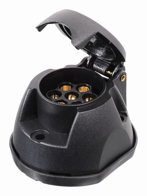 Zásuvka pro tažné zařízení automobilu dle normy DIN 1724, 7 pólů. Zásuvka je vybavena těsněním a krytem, který se automaticky (pružinou) uzavírá.