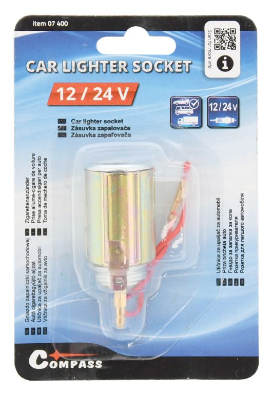 Zásuvka je sestrojena kompletně z kovu. Součástí balení je napájecí červený kabel pro připojení k 12/24V.